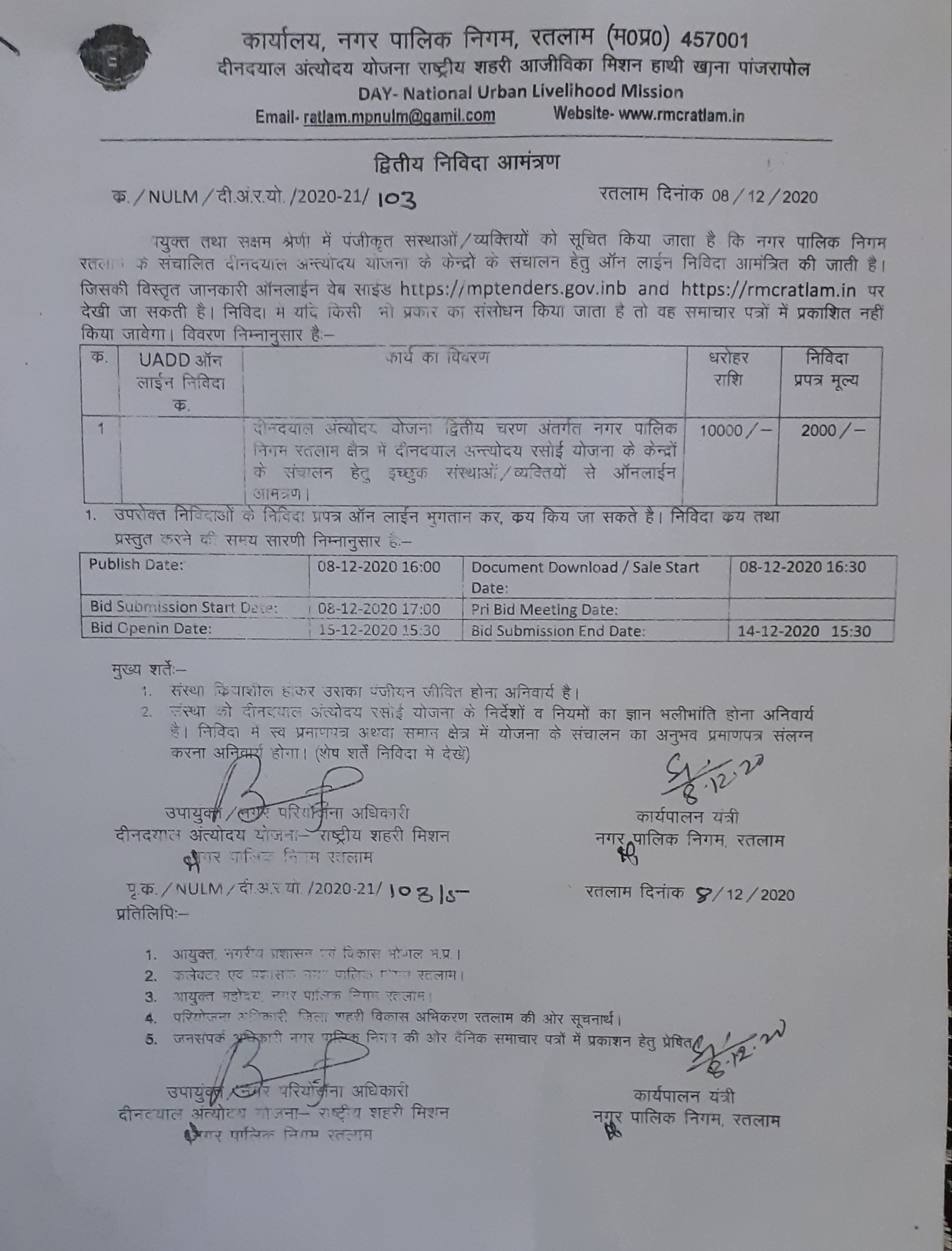| 57 | नगर निगम रतलाम अन्तर्गत विभिन्न वार्डो मे निर्माण कार्य एवं स्वच्छ भारत मिशन के अन्तर्गत वाल पेंटिंग कार्य की निविदा के सम्बंध मे |